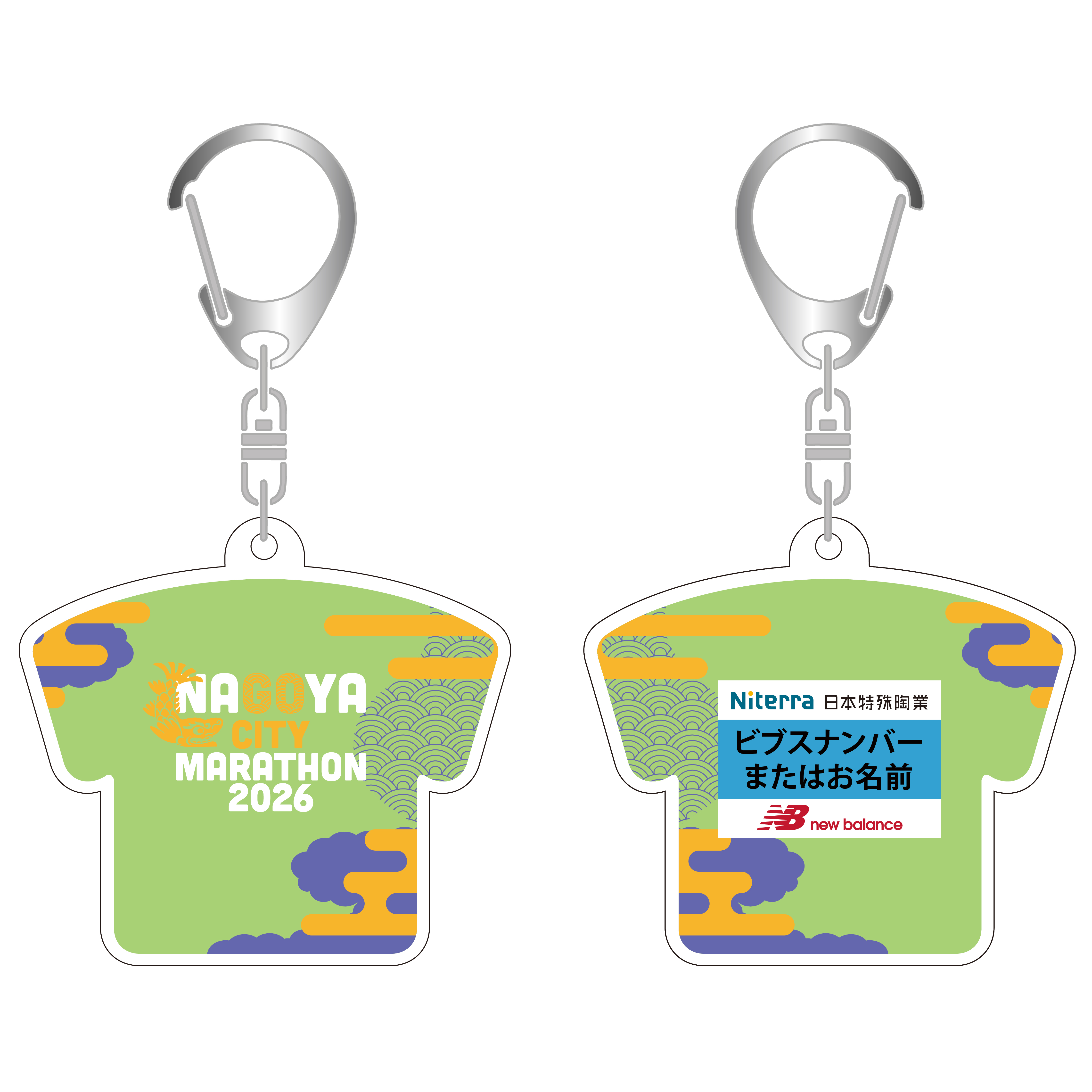 名古屋シティマラソン2026のロゴとイメージカラーをデザインしたユニフォーム型のキーホルダーです。