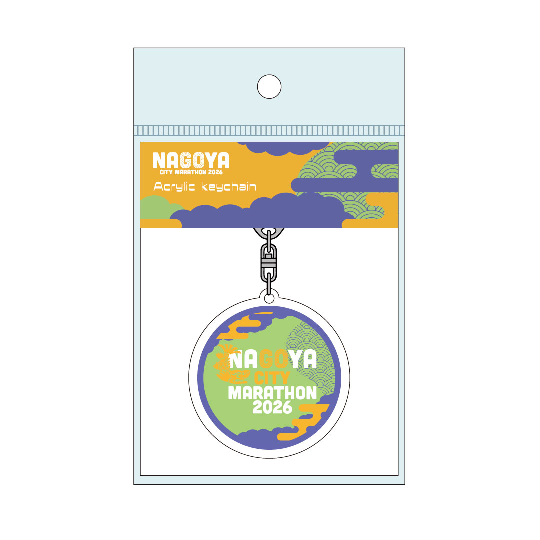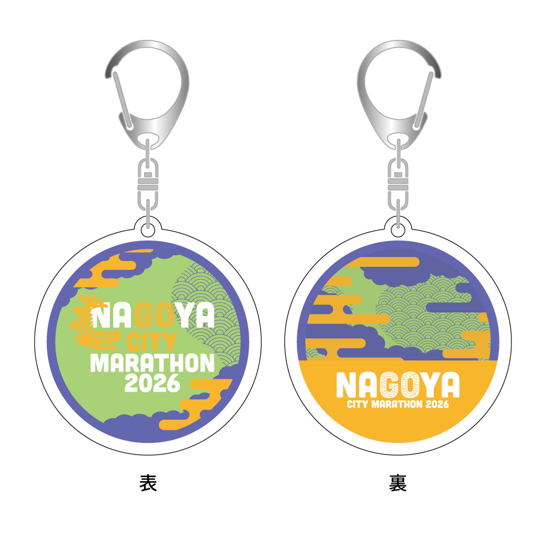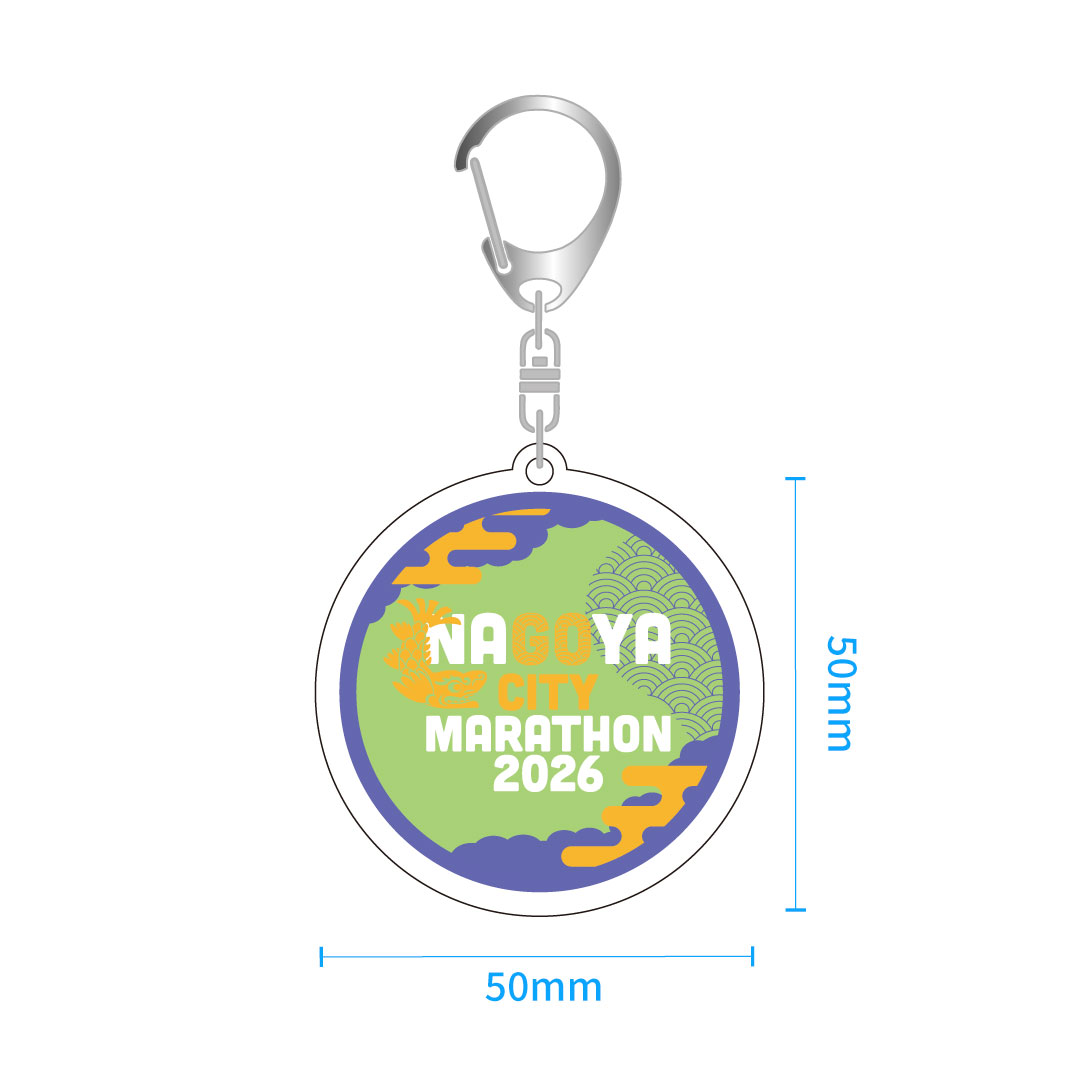 名古屋シティマラソン2026のロゴとイメージカラーをデザインしたアクリルキーホルダー。