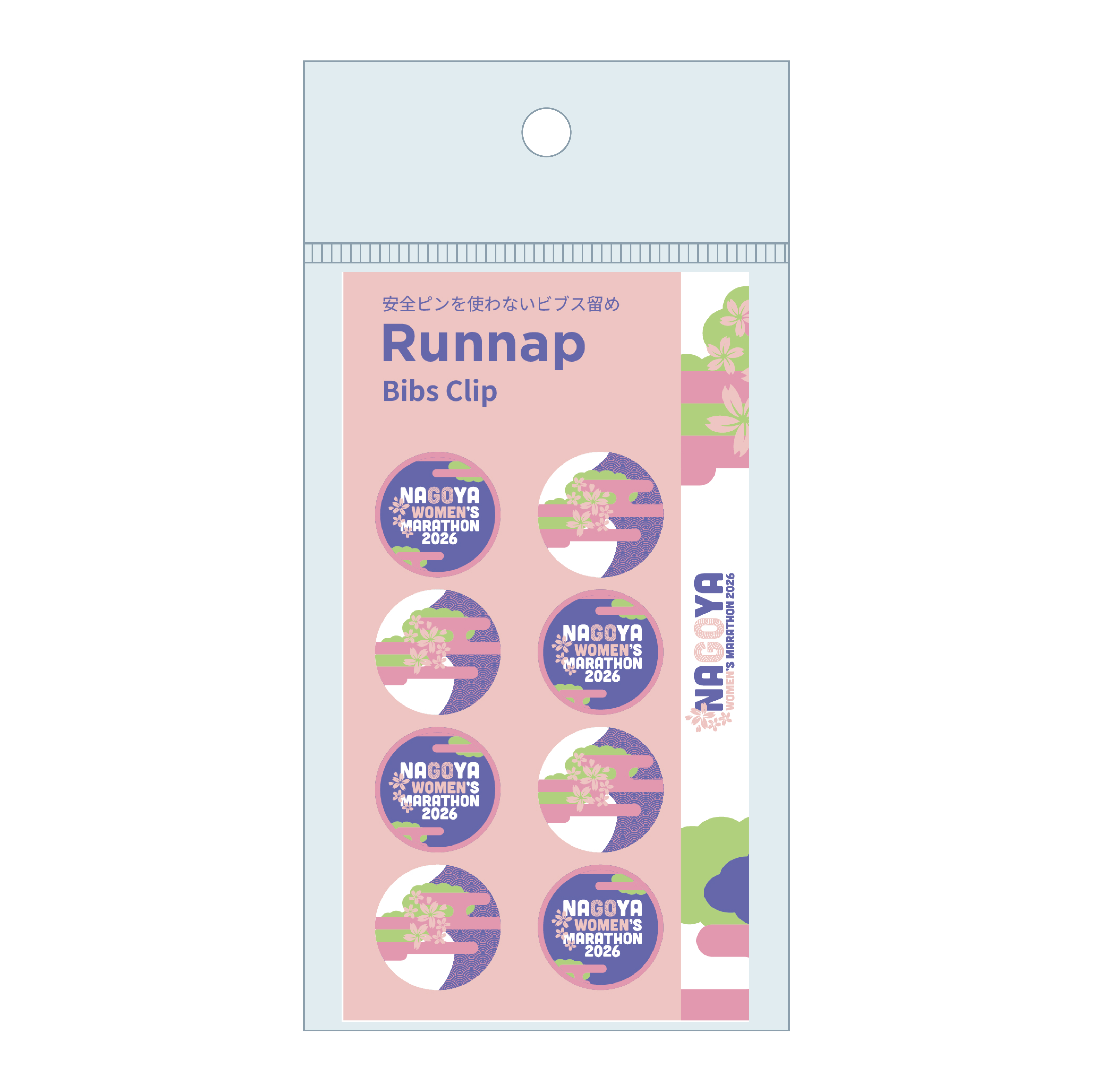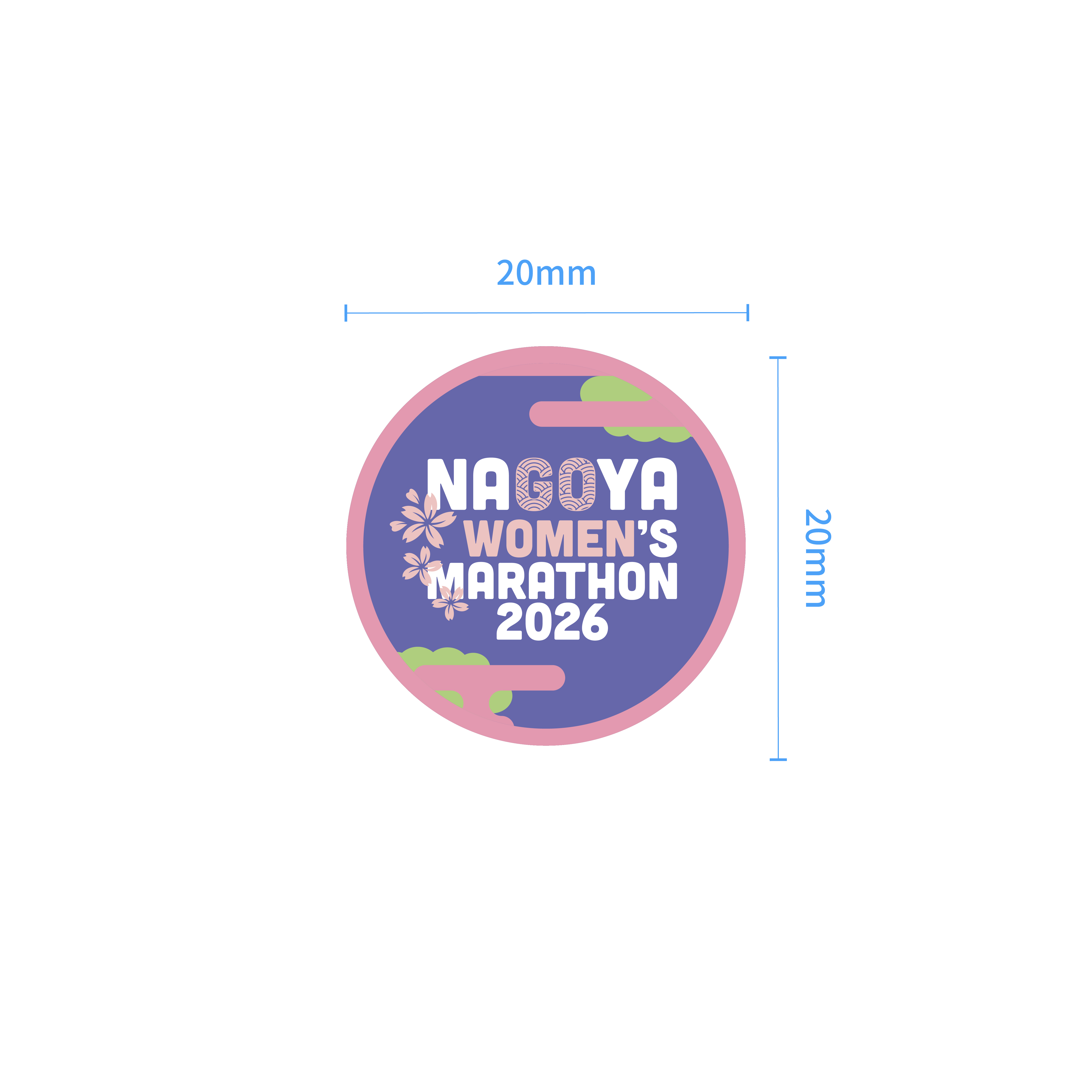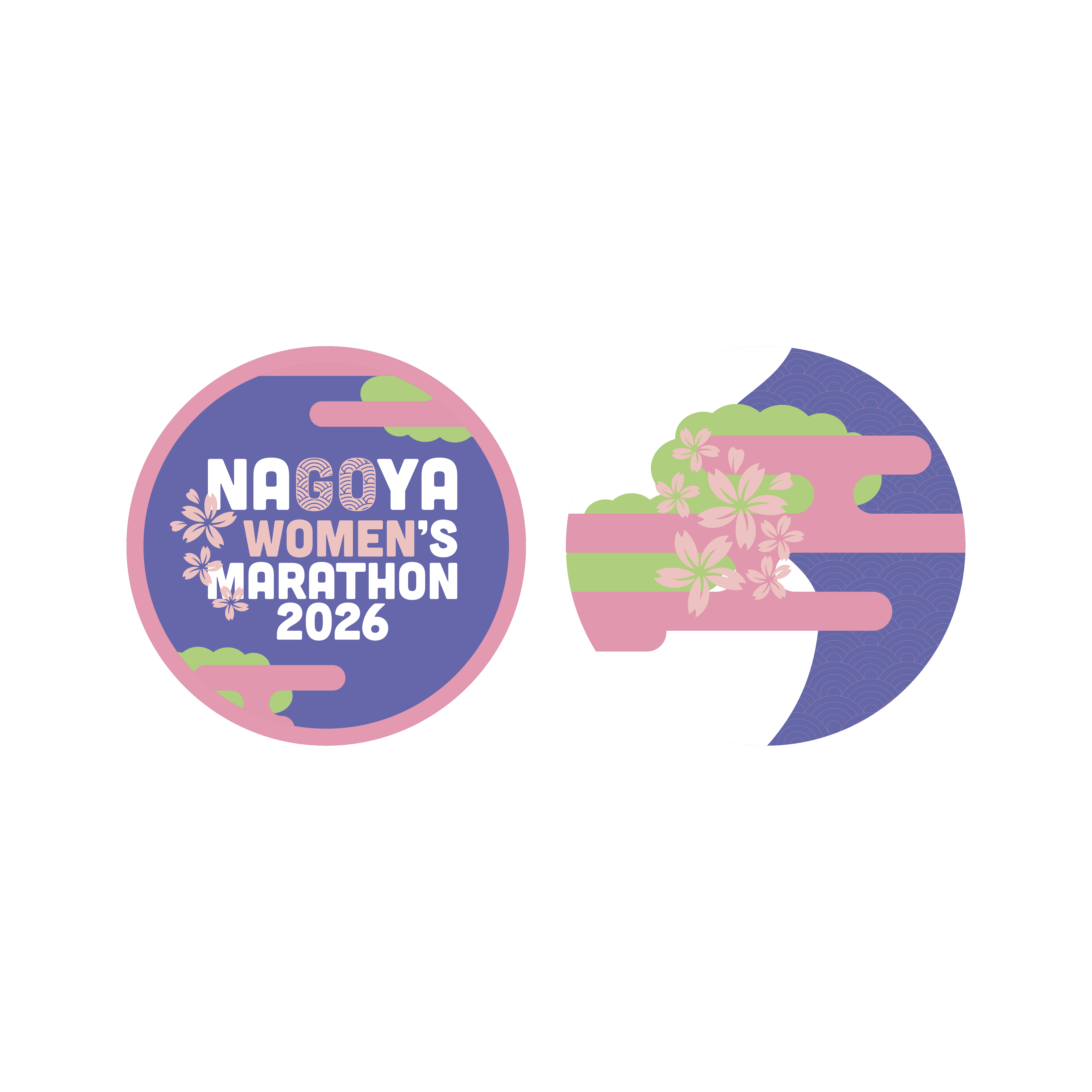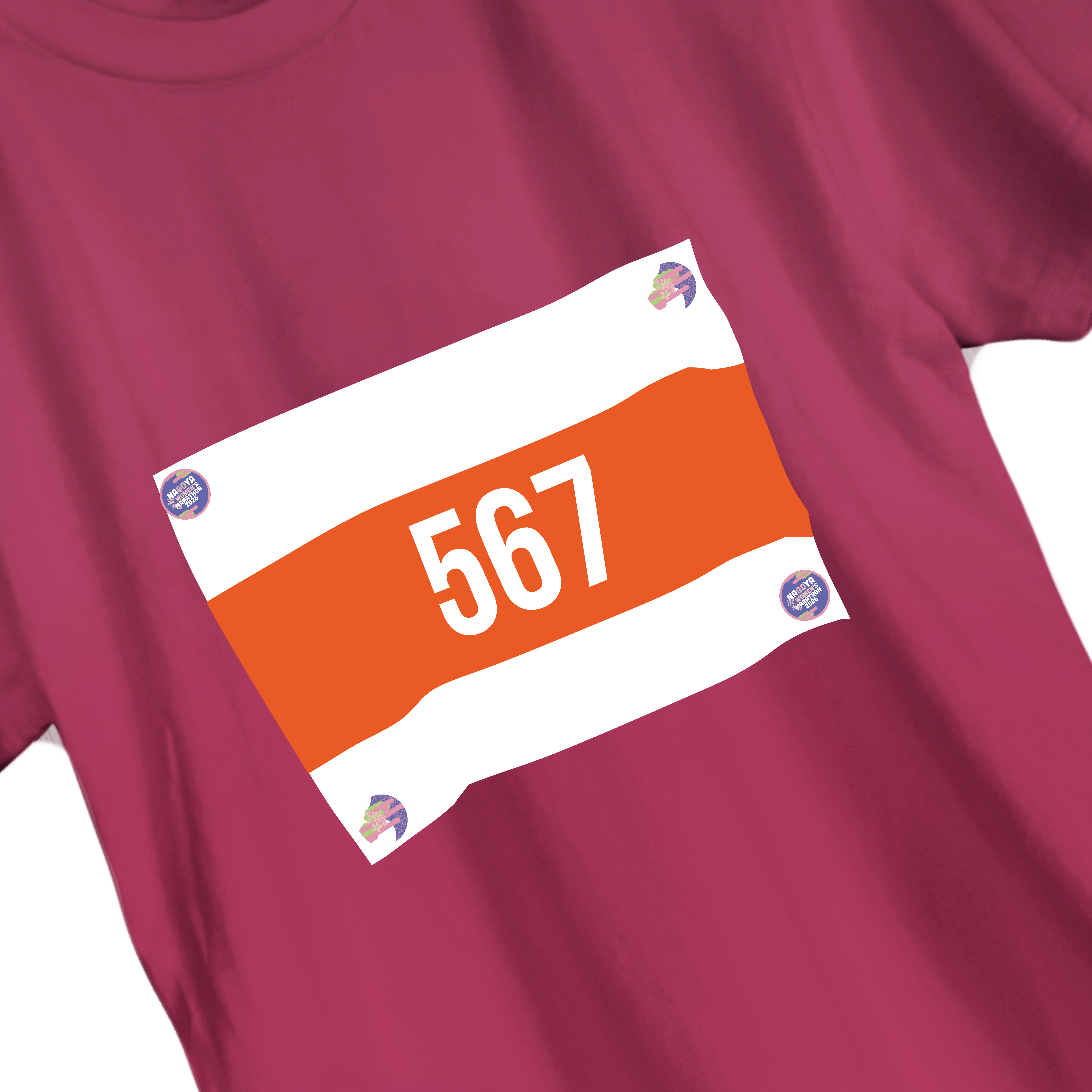 名古屋ウィメンズマラソン2026のロゴとイメージカラーをデザインしたビブス留め。