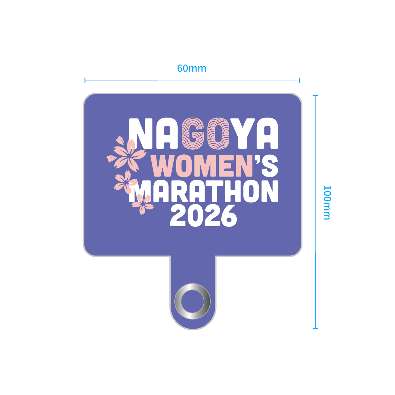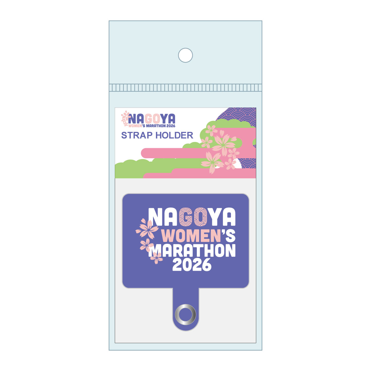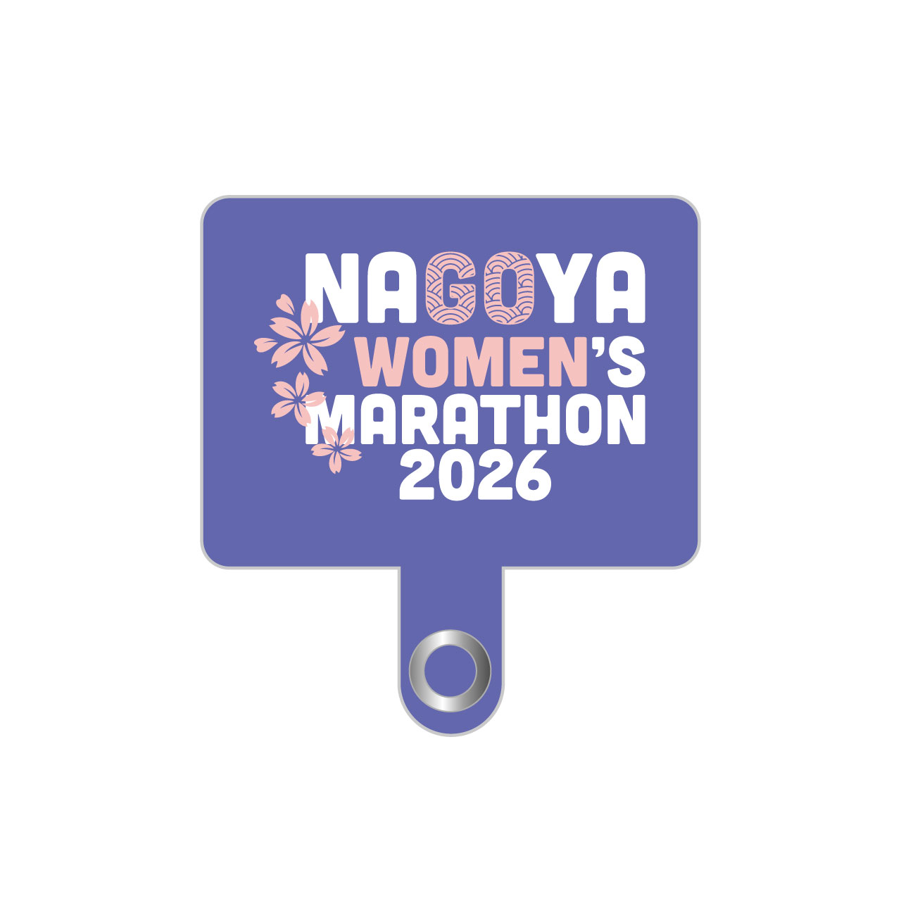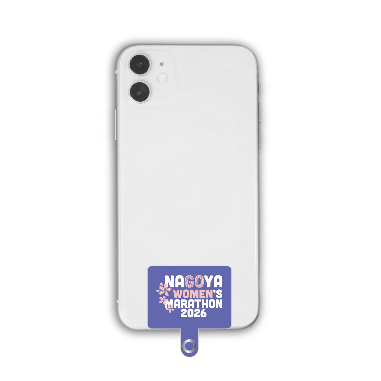 名古屋ウィメンズマラソン2026のロゴイメージカラーをデザインしたスマホストラップホルダー。端末とケースの間にストラップホルダーを挟むだけで簡単に装着できます。